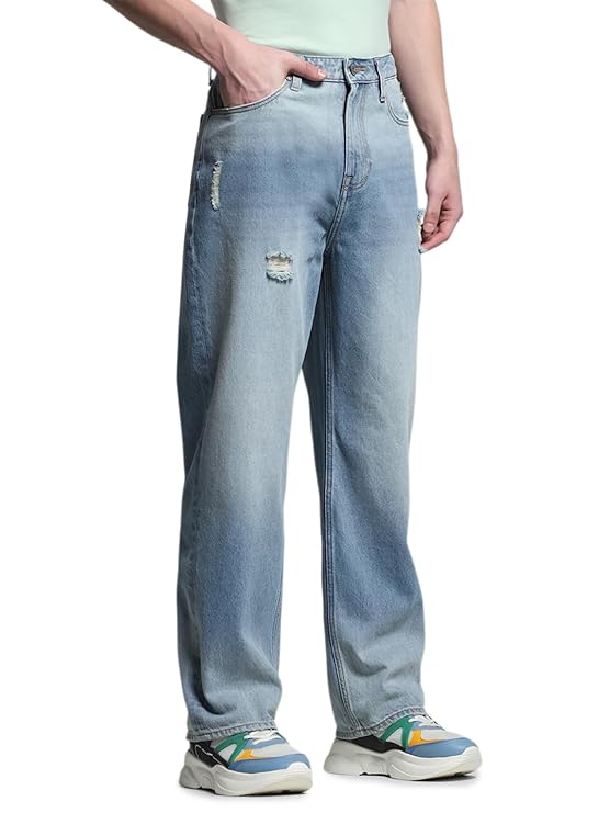 Anisto Men High Rise Wide Leg Highly Distressed Pure Cotton Heavy Fade Jeans
